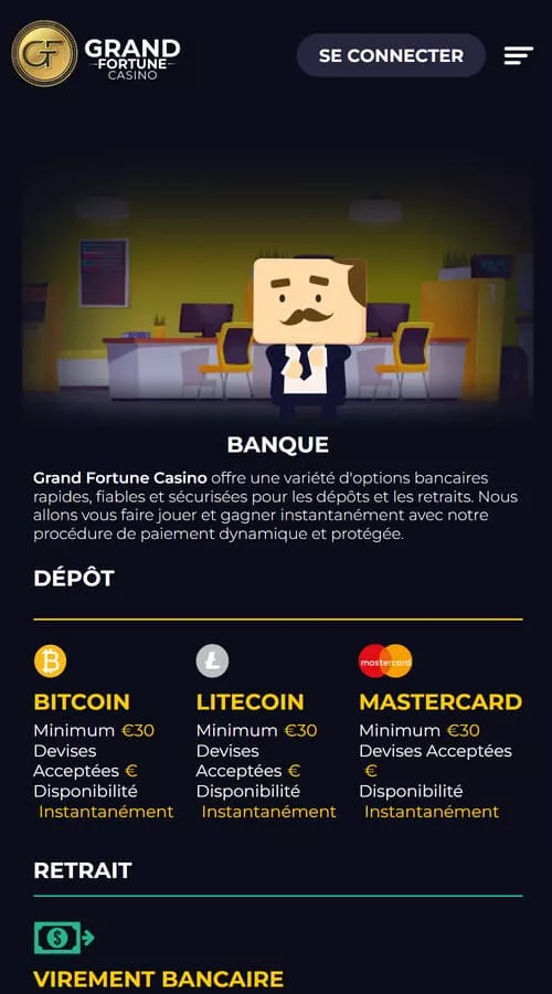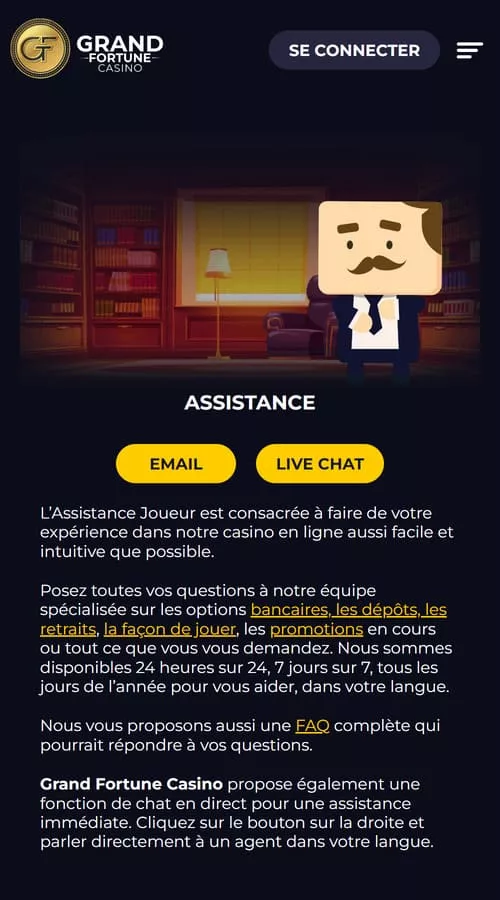 Notez tout de même que, comme avec l’application Android ou Grand Fortune Casino iOS, si elle était disponible, vous aurait permis de profiter de quasiment toutes les fonctionnalités de l’établissement en ligne. Le principal avantage d’une telle plateforme est la facilité de la connexion. Grand Fortune Casino application aurait pu être téléchargée à partir du site officiel de l’opérateur et vous aurait permis une connexion assez facile.