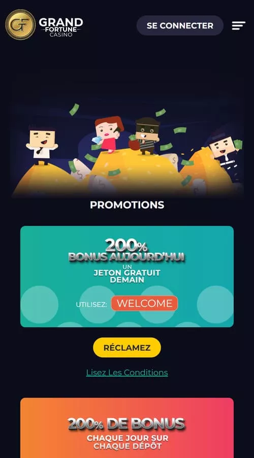 La version mobile vous permet aussi de profiter des différents bonus offerts par l’opérateur. C’est justement le moment de dire qu’il existe plusieurs Grand Fortune Casino bonus dont le bonus de bienvenue de 200%. Vous en profiterez en vous inscrivant nouvellement sur la plateforme avec votre ordinateur ou avec votre mobile.