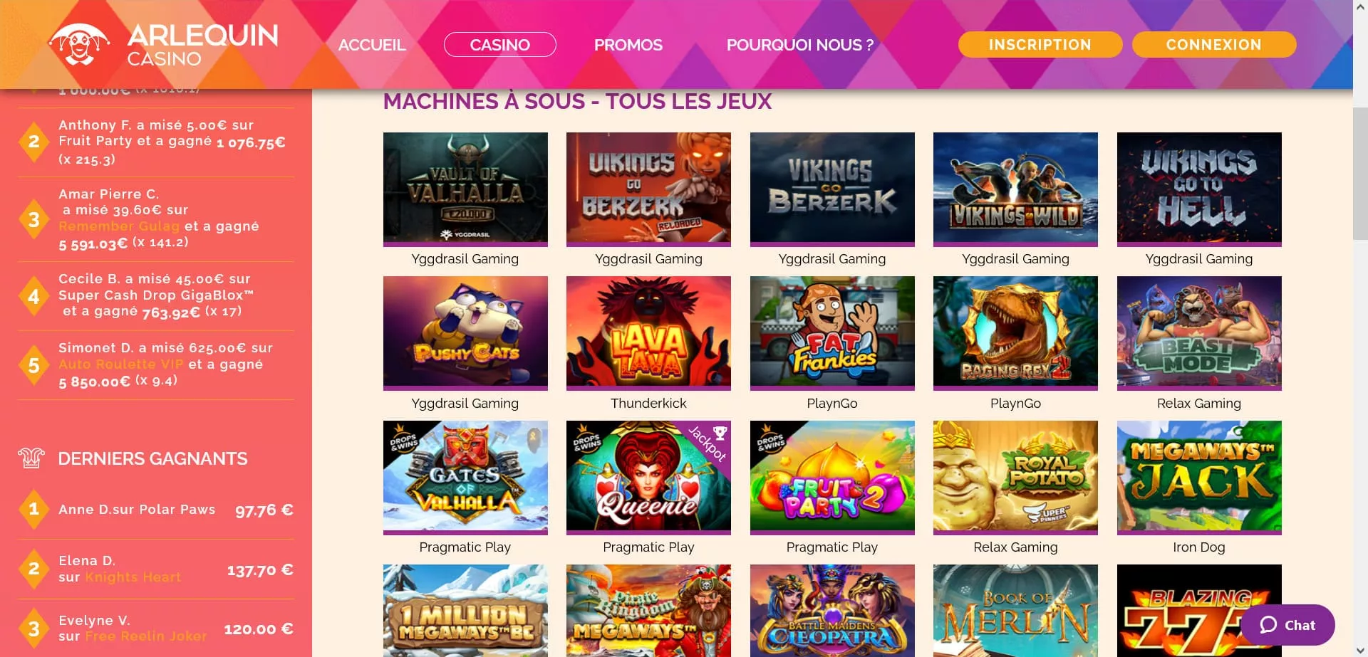 Arlequin ne présente pas moins de 2000 jeux et ne cesse d’en augmenter de nouveaux, toujours dans l’optique de rendre votre expérience avec lui unique et inoubliable. Des machines à sous, des jeux de table, des jeux de casino en live, du vidéo poker et autres jeux casinos constituent les catégories de jeux qui vous sont présentées. Ces derniers sont fournis par de nombreux éditeurs de jeux dont les plus connus: Pragmatic Play, Netent et Evolution Gaming.