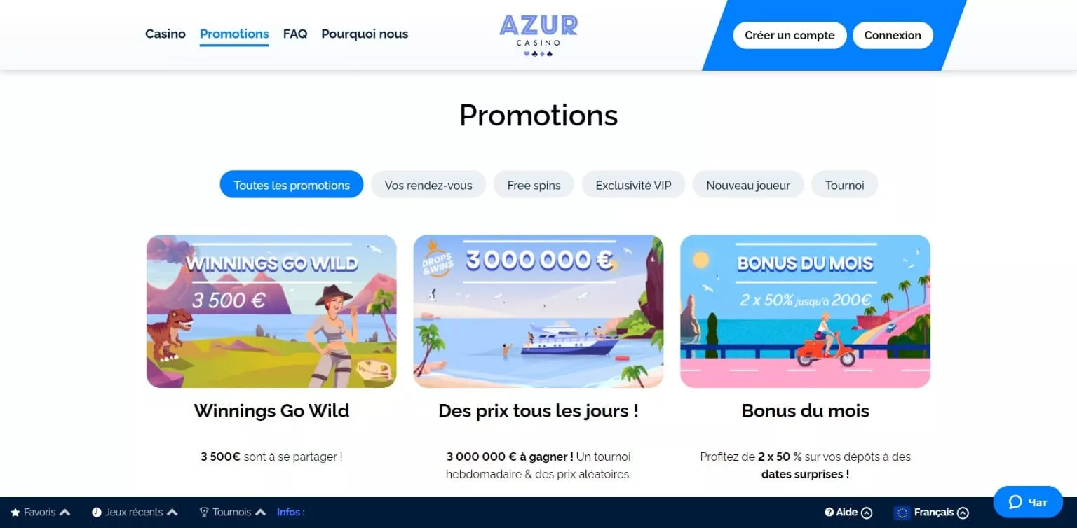 Sur le site, vous pouvez obtenir des récompenses même sans utiliser le code bonus d’Azur Casino.