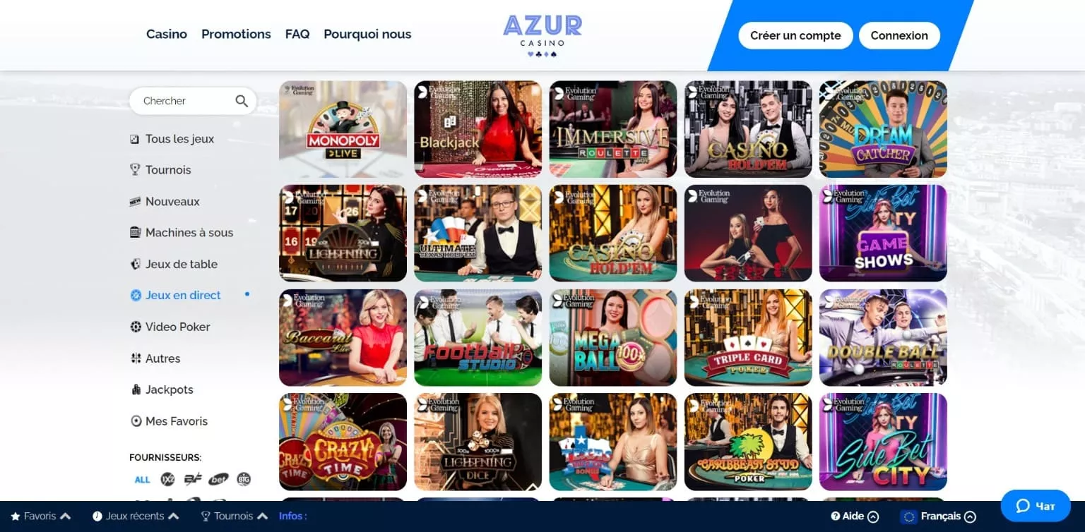 Le casino Azur en France est un casino en ligne pour les joueurs qui aiment les jeux de table traditionnels. Au sein de la section consacrée aux croupiers en direct – le point de référence des jeux en direct d’Evolution Gaming, qui a été reconnu comme offrant les plus grands jeux en direct – il est possible de découvrir des jeux originaux tels que “Monopoly Live”, “Dream Catcher”, “Crazy Time” ou encore “Live Foofball Studio”.