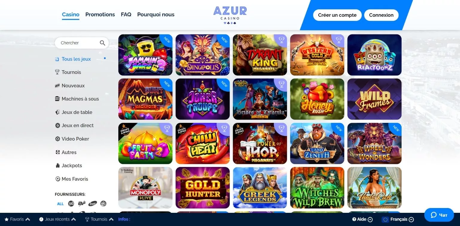 Le casino Azur fiable regroupe de nombreux fournisseurs de jeux, plus de 2400 jeux accessibles également depuis votre mobile ou votre tablette. De nombreuses animations, concours de machines à sous, tournois et jeux de jackpots sont régulièrement organisés avec les éditeurs Yggdrasil, Pragmatic Play pour les concours et Play’n Go, Isoftbet pour les jackpots. Enfin, les jeux du casino Azur comprennent également des tables de jeu en direct, fournies par Evolution Gaming, le spécialiste leader des tables de croupier en direct.