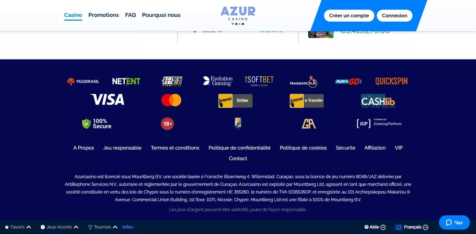 J'adhère totalement à l'interface avec la côte d'Azur. Ça a un petit côté apaisant. Mais ce qui est encore plus intéressant sur l'Azur casino, c'est bel et bien la quantité de jeux dans la ludothèque. Difficile de ne pas trouver son bonheur. Perso, j'ai découvert ce casino sur conseils d'amis joueurs et franchement depuis, il est dans mon top 5. Je vous le recommande vivement.