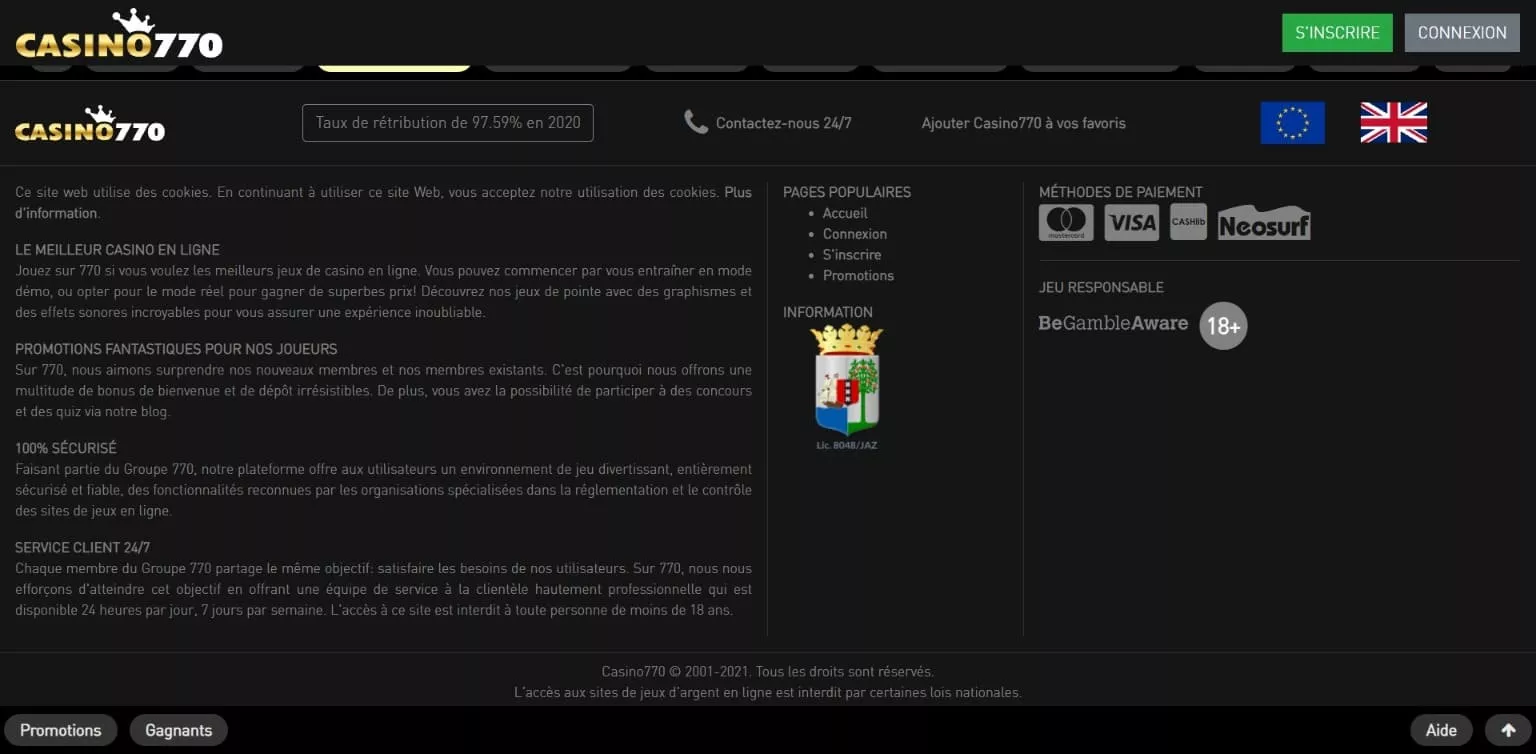 Casino770 est exploité par Cosmo Gaming Company Limited, dont le siège social se trouve à Malte. L’entreprise est déjà active sur le marché des jeux de hasard en ligne depuis 2001. Casino770 fonctionne avec une licence maltaise. Le site web est entièrement disponible en français. Même si de nombreux joueurs ont déjà pu faire leurs propres expériences sur Casino770, il existe un grand nombre de clients potentiels qui souhaitent s’informer avant de s’inscrire pour savoir si Casino770 est une arnaque ou non.