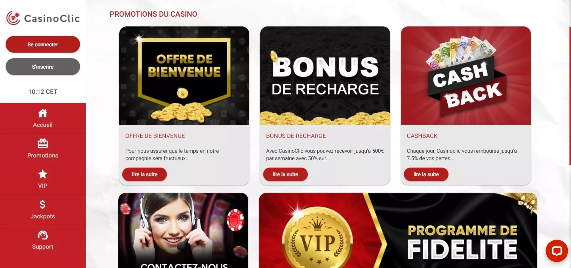 Cliquez sur VIP dans le menu de gauche pour découvrir tous les avantages exceptionnels. Ce qui fait la renommée de Casino Clic, ce sont les bonus VIP exclusifs qui permettent de remporter d’énormes gains ou d’être invité à des évènements privés. Sans parler du mode démo Casino Clic qui vous permet d’essayer les top machines ou les nouvelles attractions du casino en ligne.