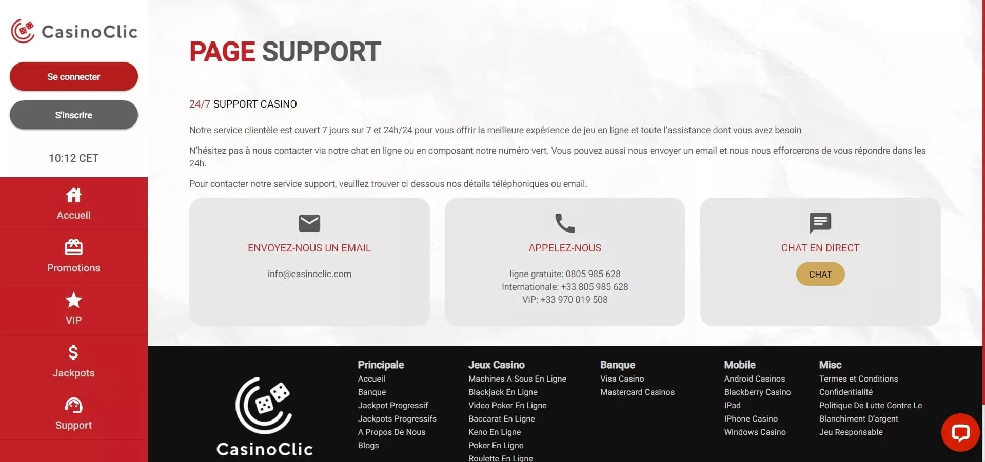 Tout casino en ligne a l’obligation d’offrir un service client de qualité. Et dans ce domaine, Casino Clic a aussi joué le grand jeu avec un service disponible 24/7 et multi canaux. Vous pouvez en effet poser toutes vos questions à des agents soit par le chat en ligne soit par email ou par téléphone. Pour satisfaire toutes les requêtes, les agents de Casino Clic font preuve d’une réactivité remarquable et de compétences hors pair.