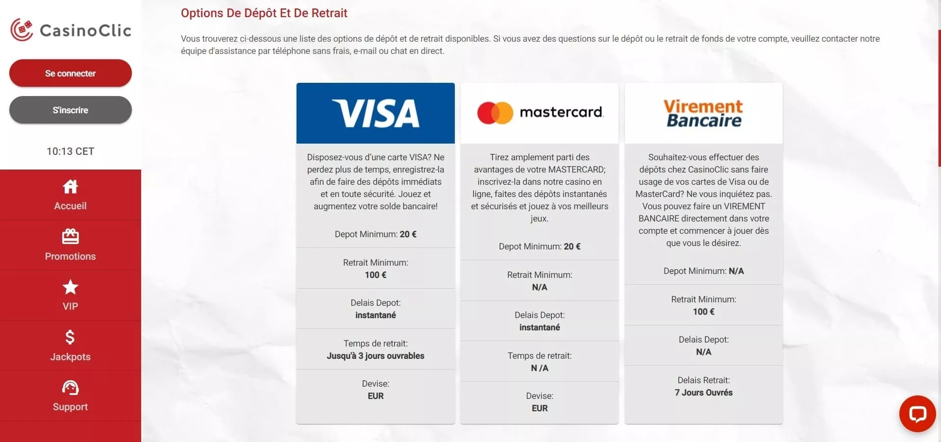 Comme dans tous les casinos en ligne, vous ne pouvez pas retirer ou déposer n’importe quelle somme sur votre compte Casino Clic. Il faut en effet respecter les sommes exigées par le casino. Pour les dépôts en bitcoin, le montant minimum est de 10€. Avec les cartes prépayées et bancaires, le montant minimum du dépôt est de 20€.
