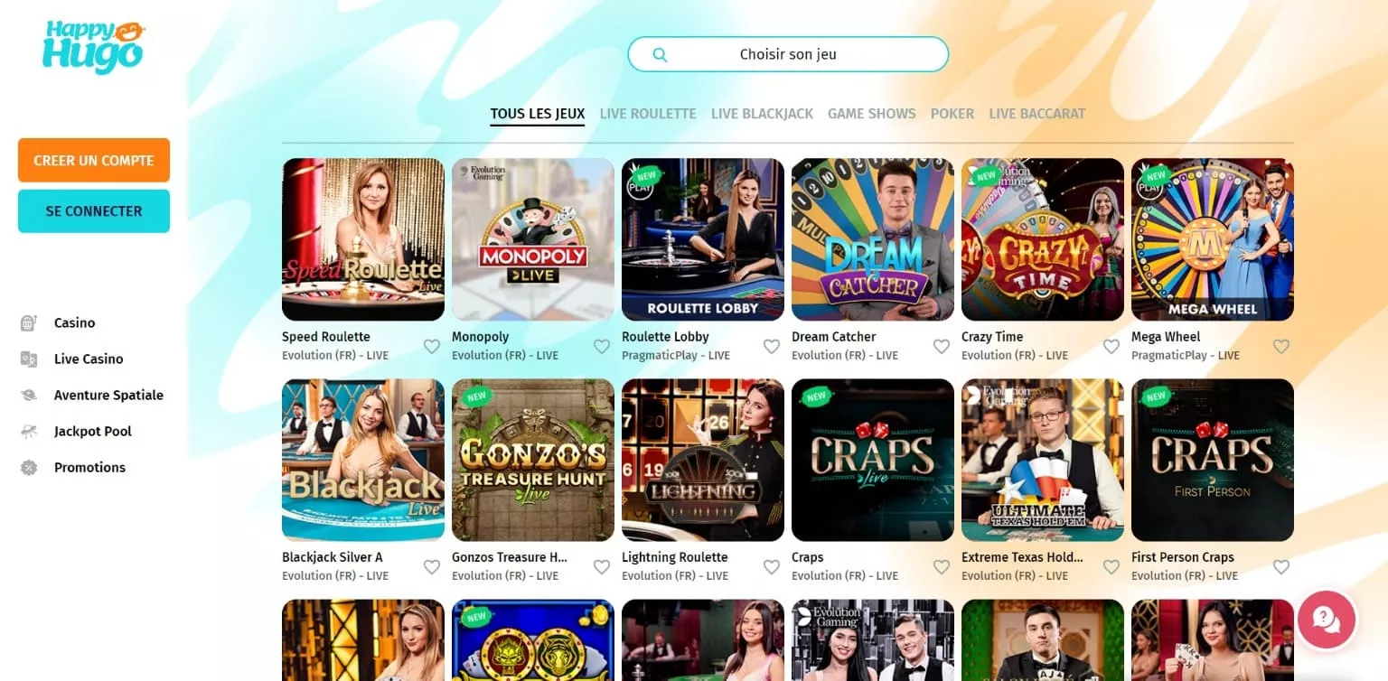 Nous avons alors réalisé que le site propose bien des tables en direct, mais qu’il ne dispose malheureusement pas d’une section qui leur soit dédiée. Dans ce cas, comment les trouver, me direz-vous? Il suffit de sélectionner ces 4 éditeurs dans le champ de recherche et une centaine de jeux de croupiers en direct s’affichent à l’écran. Parmi l’étonnant panel proposé sur le casino live Happy Hugo, vous trouverez: