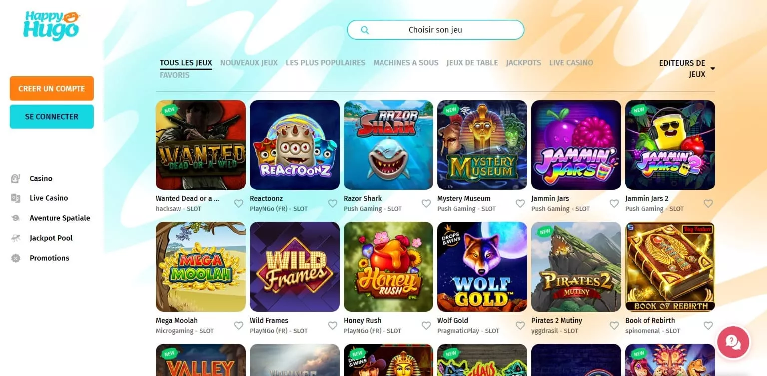 La plateforme a été développée pour satisfaire chaque type de profil de joueur tout en respectant un ensemble de normes de sécurité et de protection des joueurs. De ce fait, Happy-Hugo est le fruit d’une collaboration entre de nombreuses maisons de développement de plateforme de jeux en ligne comme: 1×2 Gaming, Amusnet Interactive, Asia Gaming, Betsoft, Booming Games, Booongo, Caleta, Elysium Studios, EvoPlay, Evolution, Fantasma Games, Fazi, Felix Gaming, Felt Gaming, Flatdog Games, GameArt, Hacksaw, Iron Dog Studio etc.