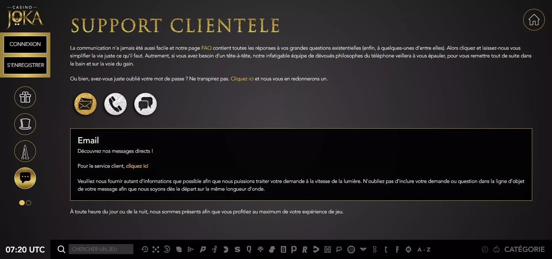 Le service clientèle du site est disponible 24 h/24 et plusieurs moyens de contact de Joka casino sont mis à disposition.