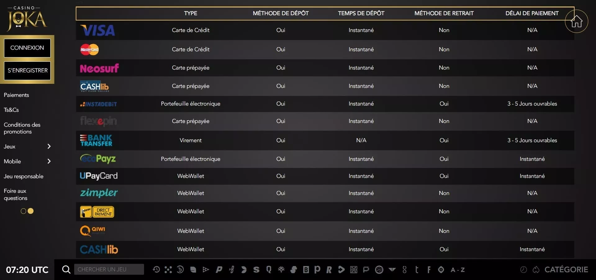 Globalement, Joka casino dit mettre entre 3 et 5 jours pour analyser et valider les demandes de paiement de ses joueurs. Une durée que nous avons trouvée raisonnable. Pour ce qui est des méthodes de paiement disponibles sur la plateforme, si elles sont multiples, elles ne sont pas toutes éligibles pour effectuer des retraits. Nous allons donc vous les présenter selon leurs usages.