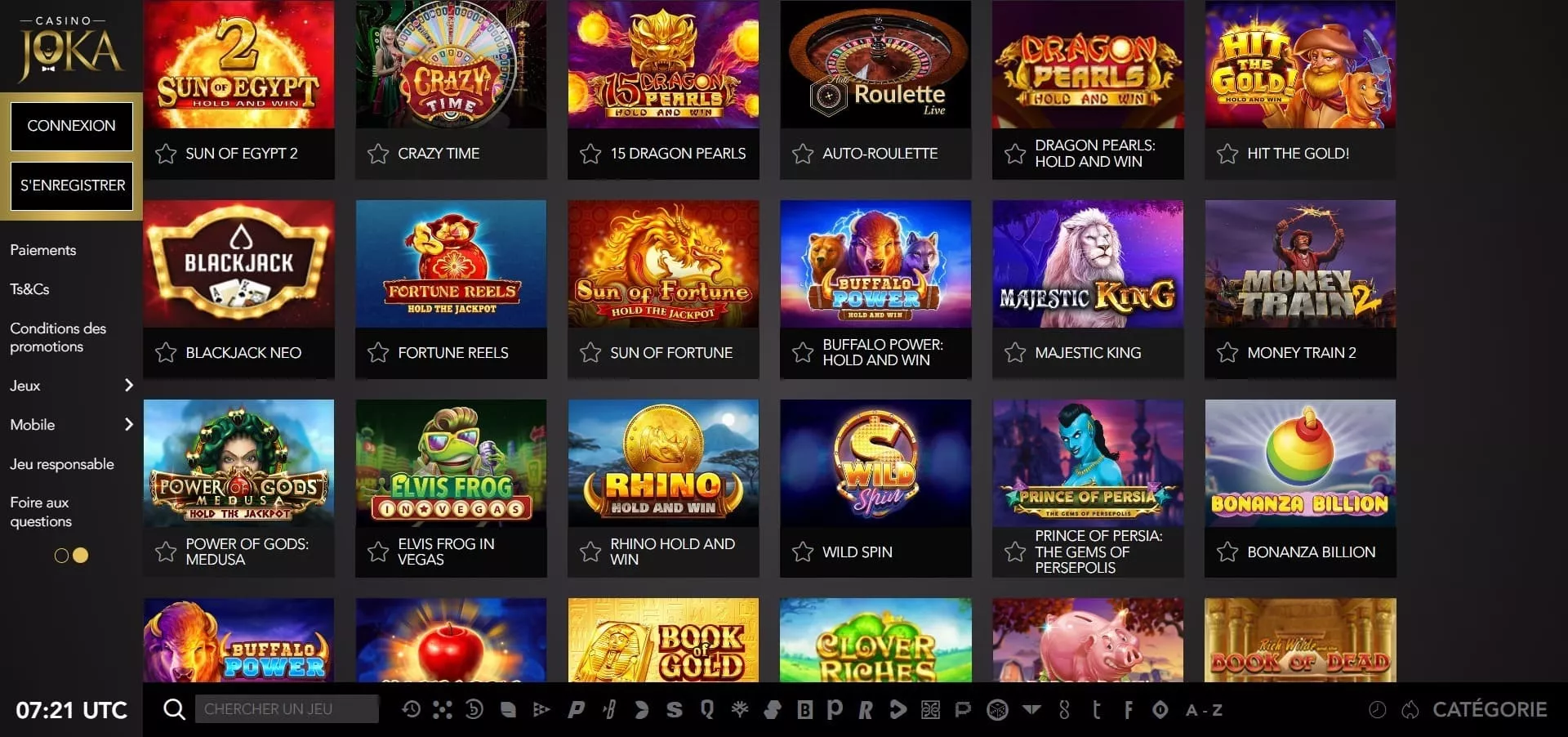 Le choix des couleurs sombres pour l’interface du site est agréable pour la vue. Il en est de même du personnage, du moins de l’image de la mascotte du casino. En jetant un coup sur la disposition des onglets, le moins que l’on puisse dire, c’est que Casino Joka FR a tenu à proposer quelque chose de différent aux joueurs français, belges et canadiens.