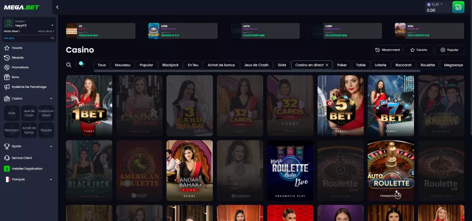Notre revue du casino Mega.bet pour les joueurs français en 2025 ne serait pas complète sans un examen des jeux. Vous trouverez ici des machines à sous, des jeux de table et même un casino en direct. Dans le casino en direct, vous trouverez des jeux tels que la roulette et le poker dans une grande variété de variations. Un autre aspect positif des casinos est que les jeux sont divisés en différentes catégories. Il est donc facile de trouver le jeu que vous recherchez. Voici quelques-unes de ces catégories: