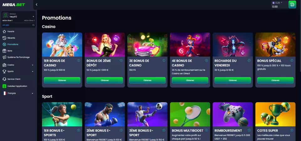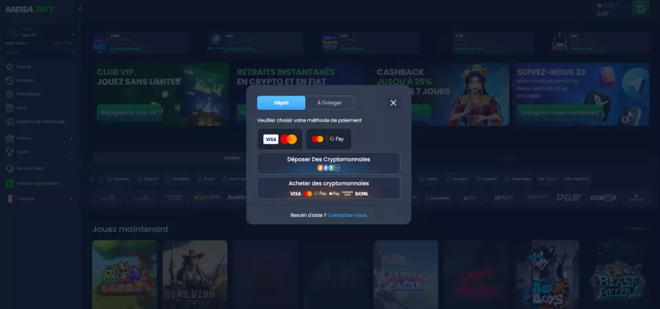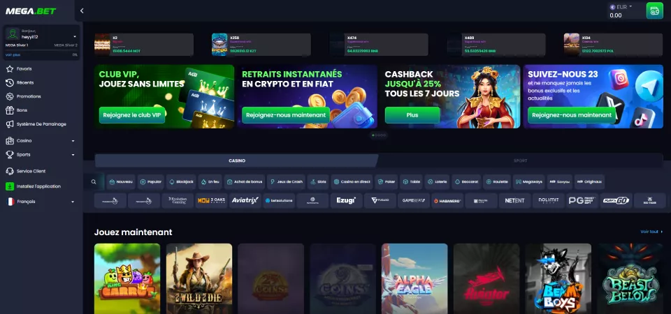 Les joueurs français de Mega.bet peuvent également profiter de bonus de jeu, y compris un bonus pour les quatre premiers dépôts, et participer à diverses promotions. Plus de 7000 jeux sous licence sont disponibles, ainsi qu’une vaste bibliothèque de machines à sous, de tables de croupiers en direct et de jeux de casino classiques, tous garantis équitables et passionnants.