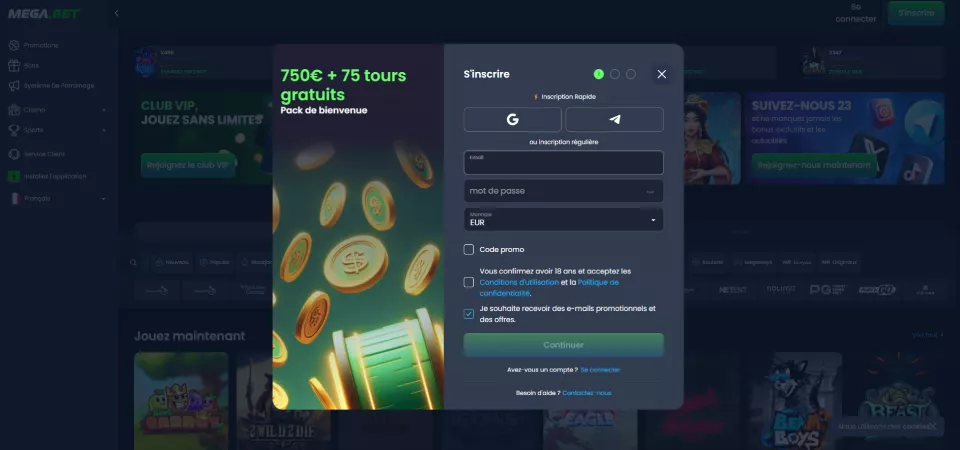 Pour accéder au site, vous devez avoir un profil enregistré. Le processus d’enregistrement d’un compte au casino en ligne Mega.bet ne prend pas beaucoup de temps, il vous suffit de remplir vos données de base et de passer la vérification par numéro de téléphone. Après cela, vous pouvez vous connecter en toute sécurité en entrant votre email et votre mot de passe.