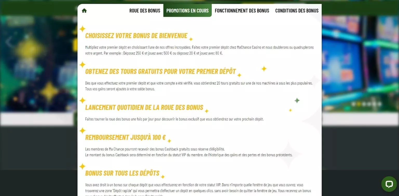 Les nouveaux joueurs ont la chance de bénéficier de deux types de bonus Ma Chance Casino. Autrement dit, c’est le joueur qui, une fois inscrit sur la plateforme et après avoir effectué son premier dépôt, choisit son bonus de bienvenue.