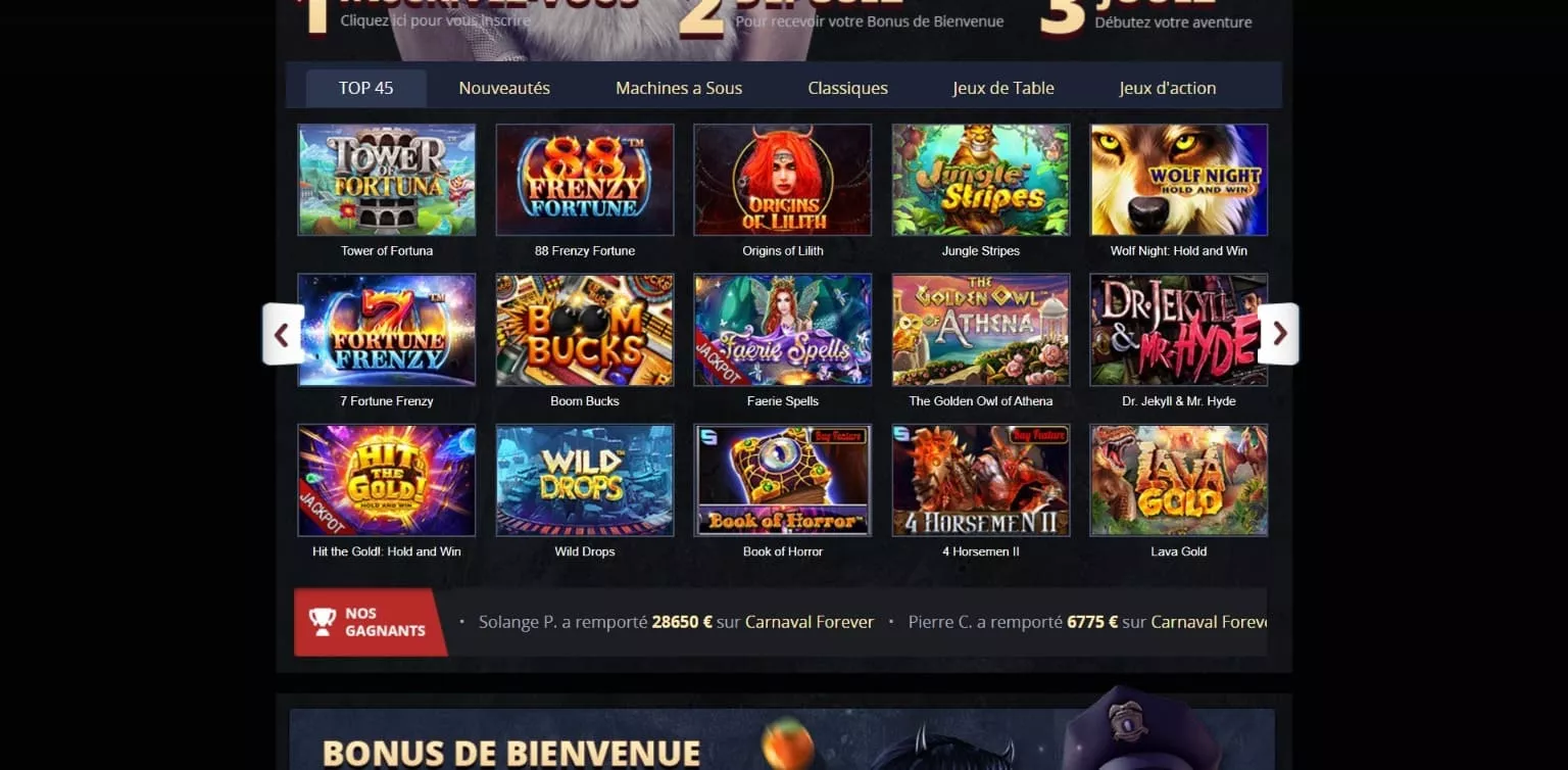 Top 45: le casino propose une liste de 45 jeux parmi les plus joués sur son interface. Pour ainsi dire, les nouveaux joueurs peuvent débuter ici en choisissant des jeux qui sont classés parmi les meilleurs. En voici quelques exemples: