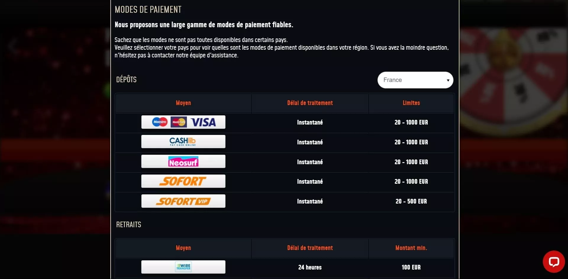Les retraits d’argent s’effectuent à partir de la section ‘’Mon compte’’. Vous y verrez en effet l’option «Retirer» à partir de laquelle, vous ferez votre retrait. Le moyen de retrait sur le site pour les joueurs français est Wire Transfer. La somme minimale que vous pourrez retirer est de 300 €.
