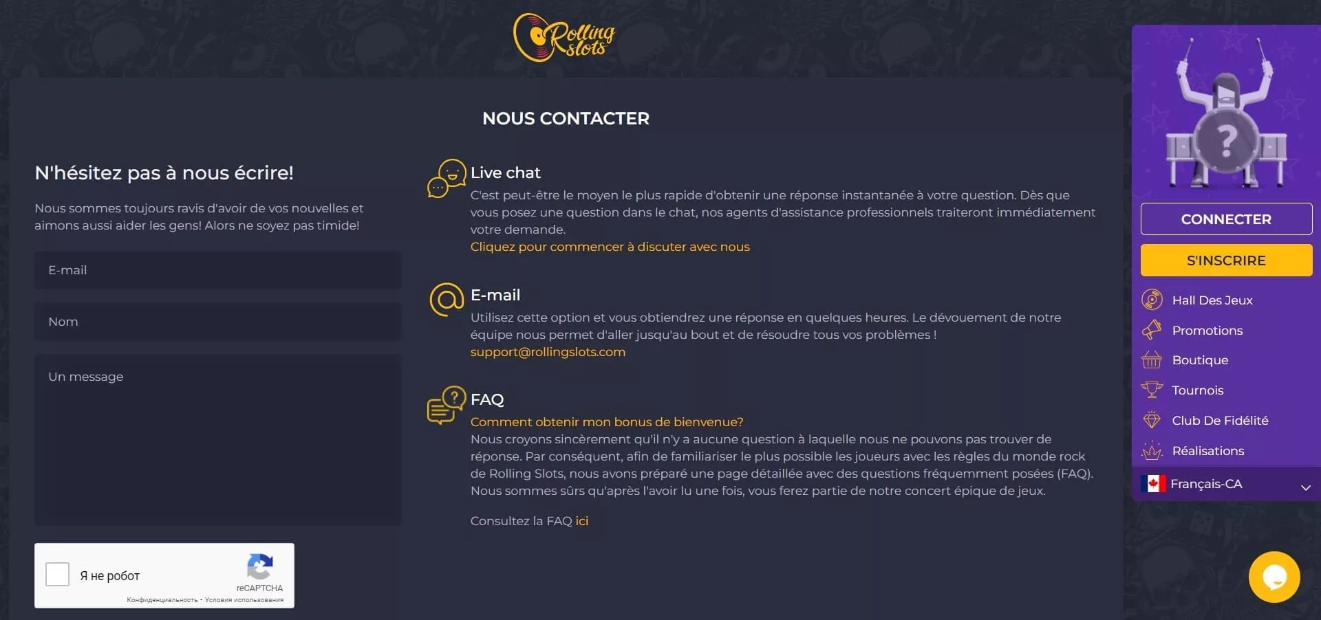 Le service client de du Casino Rolling Slots est disponible 24 h / 24 et 7 j / 7. Même si un numéro de téléphone Casino Rolling Slots ne figure pas dans la liste des moyens de contact du casino, les joueurs français peuvent contacter l’assistance de celui-ci via: