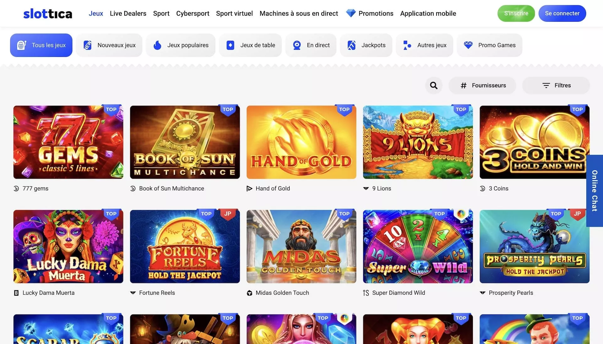 Slottica n’écarte pas les opportunités pour ceux qui souhaitent frapper fort ! Le nombre total de jeux offrant des jackpots avoisine 1 000! Beaucoup sont des jeux à jackpot progressif RTG; certains ont des fonctions Drops&Wins ou Hold and Win, ce qui permet de gagner beaucoup plus facilement. Quant aux noms, ils comptent des géants comme Wolf Gold, Scarab Temple, Sun of Egypt, 15 Dragon Pearls et Thunder of Olympus.