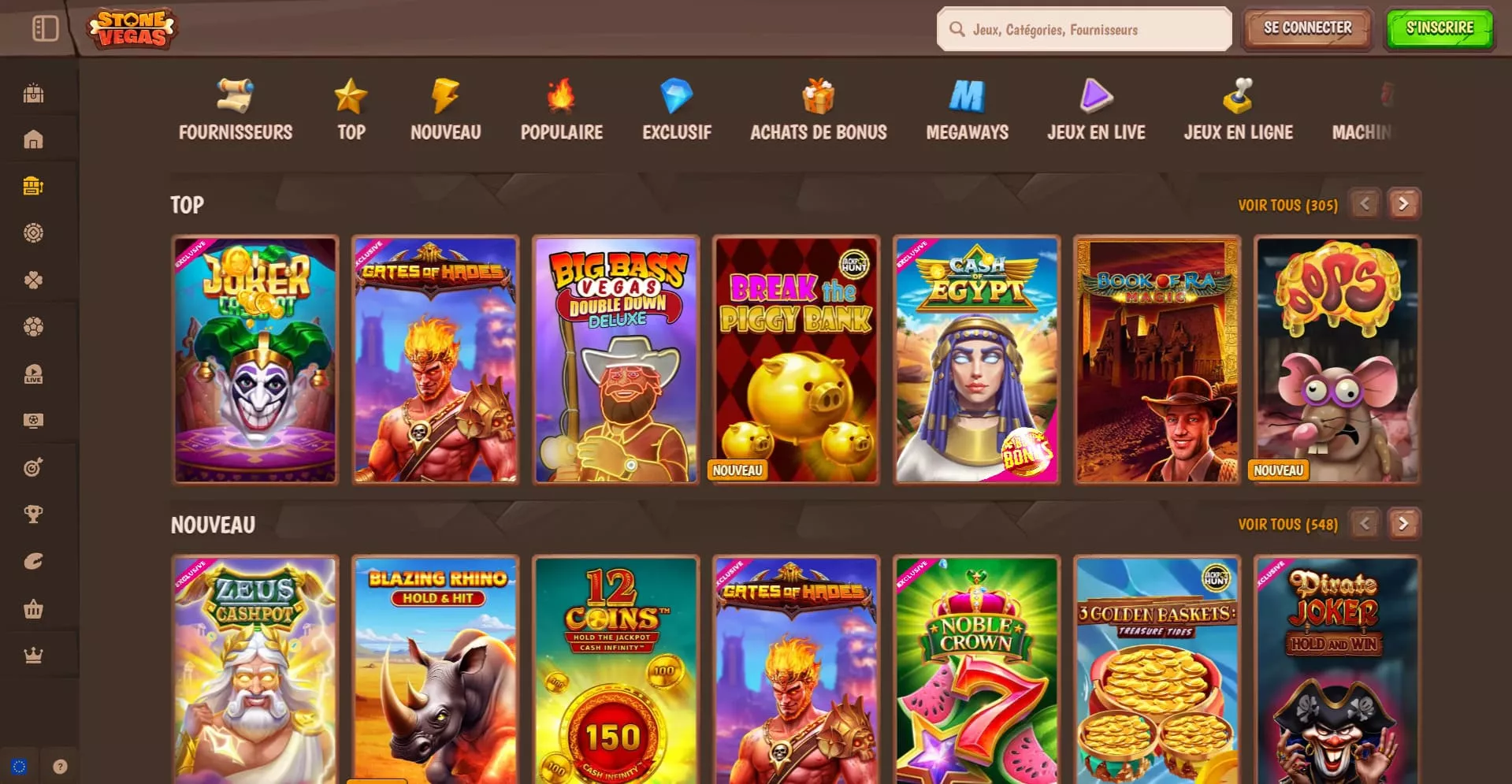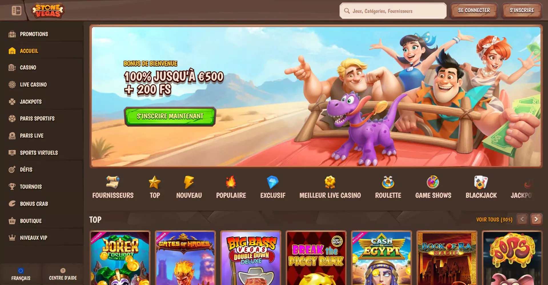 StoneVegas propose plus de 7500 jeux issus de 80 fournisseurs réputés. Une fois inscrit, le joueur accède à une large gamme de catégories: