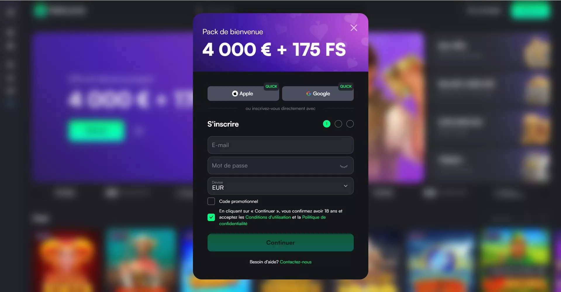 Package de bienvenue 250% jusqu’à 4000 EUR + 175 TG