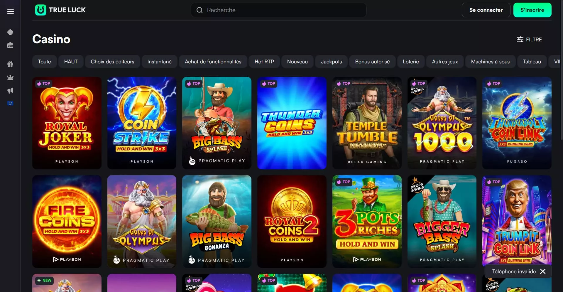 Plus de 6 000 jeux de casino TrueLuck sont disponibles et la bibliothèque comprend des titres provenant de la plupart des principaux fournisseurs de logiciels du marché. Vous trouverez des jeux de géants tels que Spribe, Betsoft et NetEnt, mais vous pourrez également découvrir des créations intéressantes de développeurs moins connus, comme Fugaso et Pocket Games Soft.