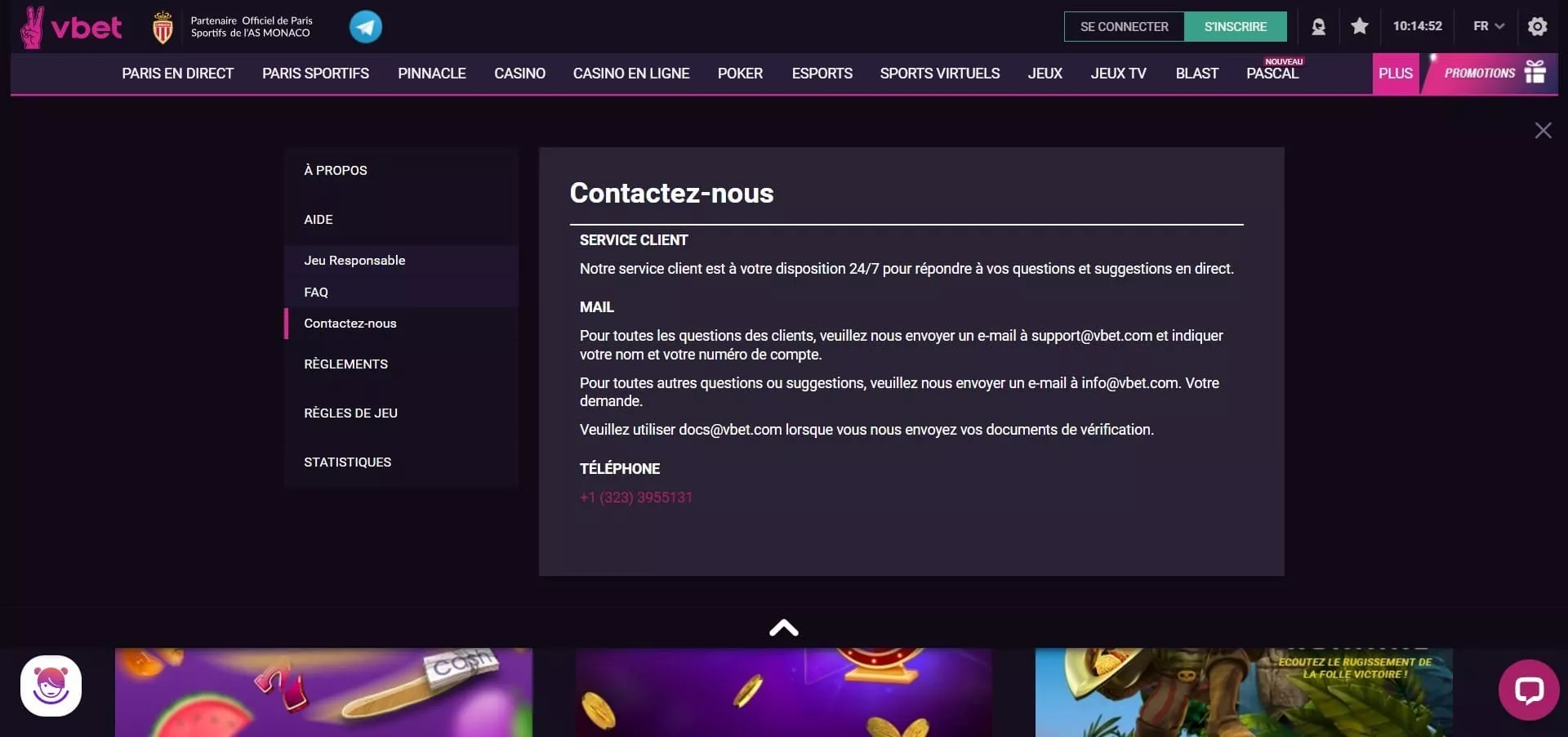 Vous pouvez établir un VBet casino contact en joignant l’équipe du support via le chat disponible 24H/24. Trois courriels sont également disponibles: le support@vbet.com et info@vbet.com sont destinés à vos préoccupations, tandis que le docs@vbet.com est réservé pour les pièces justificatives. Si vous préférez un contact plus direct, utilisez le téléphone casino VBet qui est le +1 (323) 3955131.