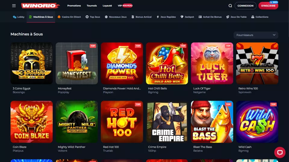 Jeux du casino Winorio propose plus de 10 000 titres des principaux développeurs du secteur. La collection comprend des machines à sous des jeux de table, un casino en direct et des divertissements spéciaux avec jackpot.